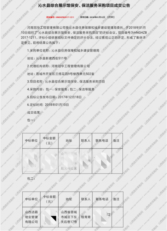 (2)沁水縣綜合展示館保安、保潔服務(wù)采購項(xiàng)目成交公告