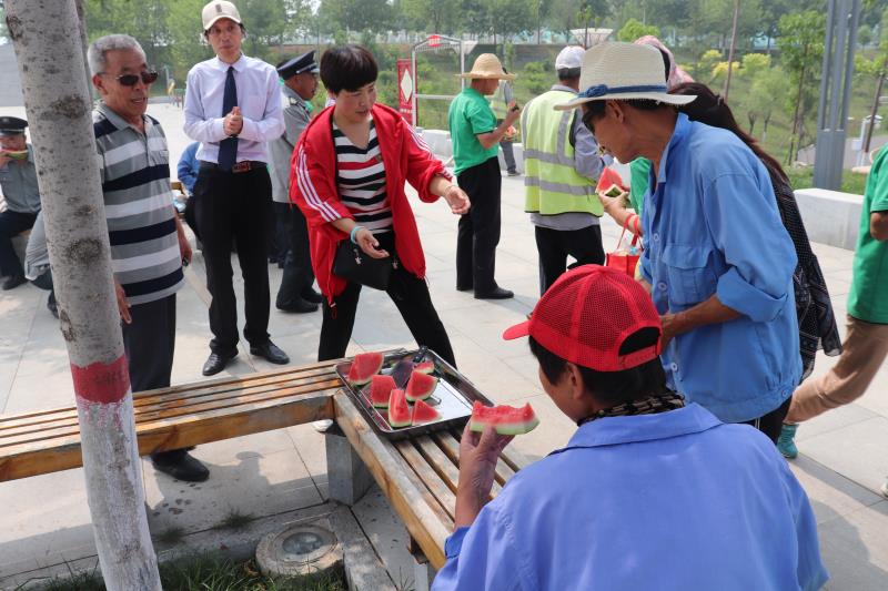 在公園的小廣場,慰問小組工作人員為員工切好西瓜,把西瓜、面包、白糖依次遞到員工手中,員工們親切的笑聲與慰問人員的互動形成了親情、溫情的交織,一片生動和諧的場面。雖然是一個個面包,一塊塊西瓜、一袋袋白糖,卻使員工永遠記住了這美好時光。崔主席也親自為員工切起了西瓜,員工們品嘗著西瓜和面包,感受著領導的關懷,決心做好自己的本職工作,為晉城創(chuàng)建全國文明城市做出積極貢獻。
