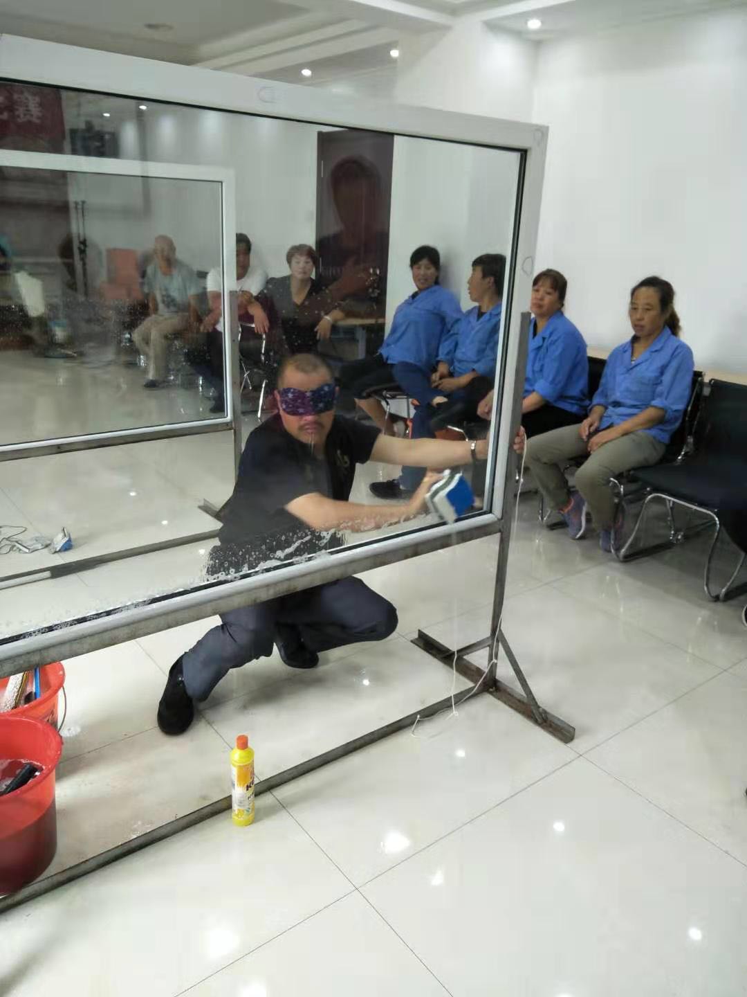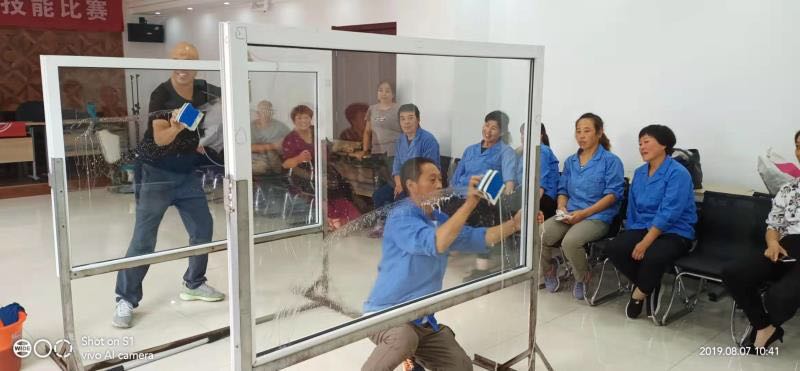 賽前,公司總經(jīng)理程晉軍、工會主席崔偉作了致辭動員。比賽選手個個摩拳擦掌,躍躍欲試。首先進行的是洗地機障礙演示技能比賽,比賽過程中每個選手都能嫻熟地安全避過比賽設置的障礙并能按正規(guī)操作章程進行,展示了過硬的操作技能;在高空外墻清洗安全防范實際演示過程中,穿工衣、帶安全帽、系安全繩以及放繩整個過程細致到位,一氣呵成;接著大家期盼的蒙眼擦玻璃賽將技能比賽推向了高潮,這是最富觀賞性的比賽,大家在佩服選手熟練的手法和技巧時,也對工程部對于服務質(zhì)量和技術(shù)的高要求感到敬佩。比賽中洋溢著歡歌笑語,公司副總經(jīng)理張永智對比賽進行了實時精彩的點評。