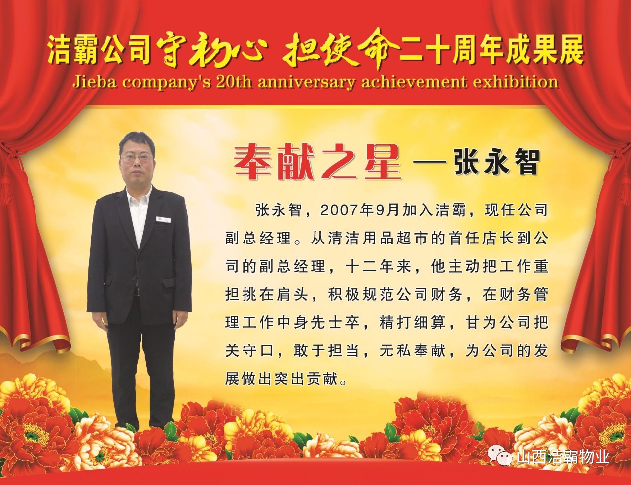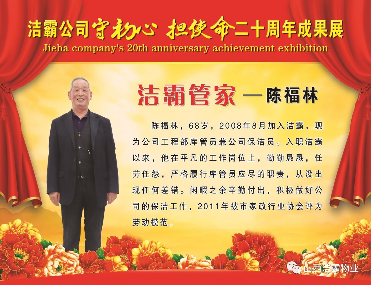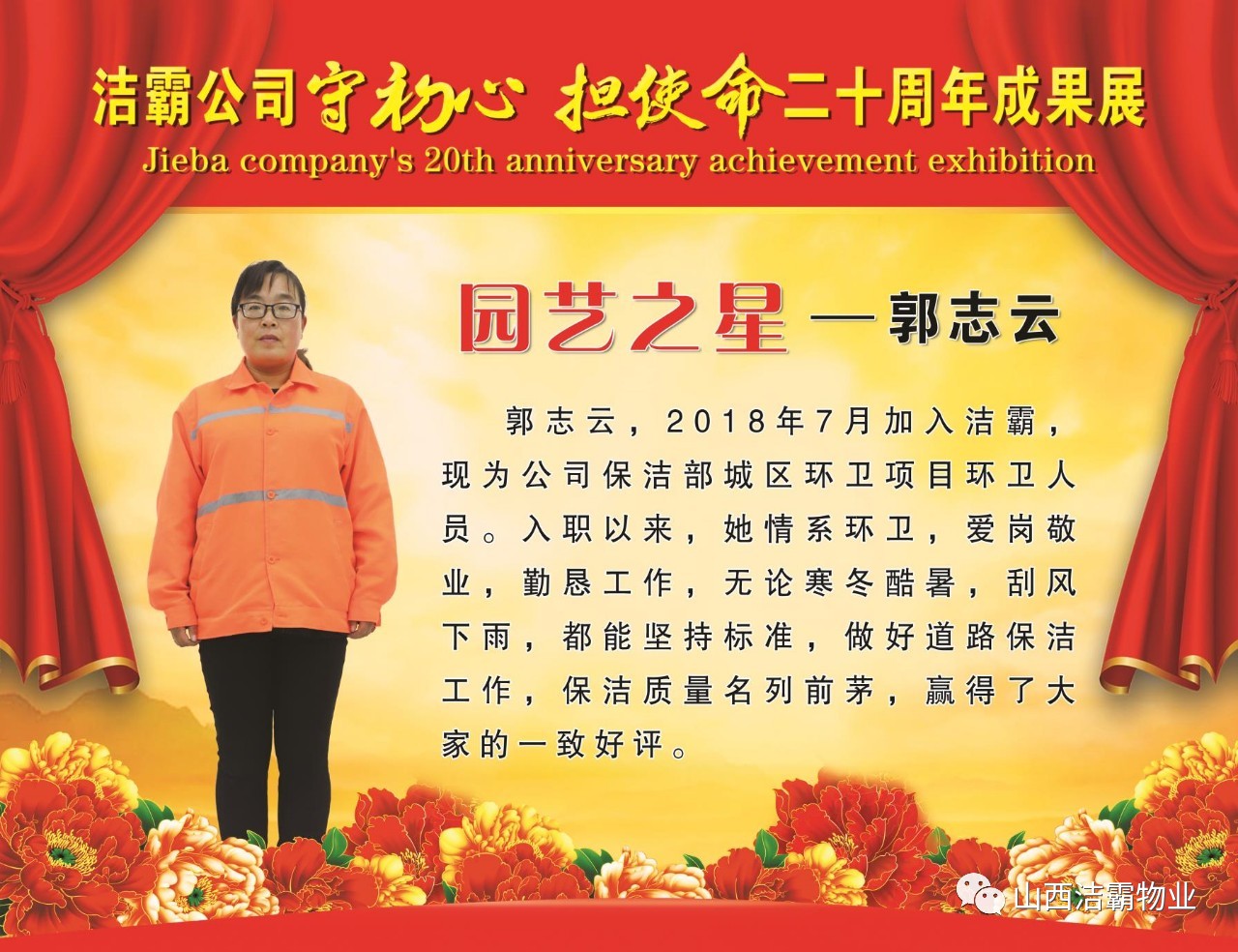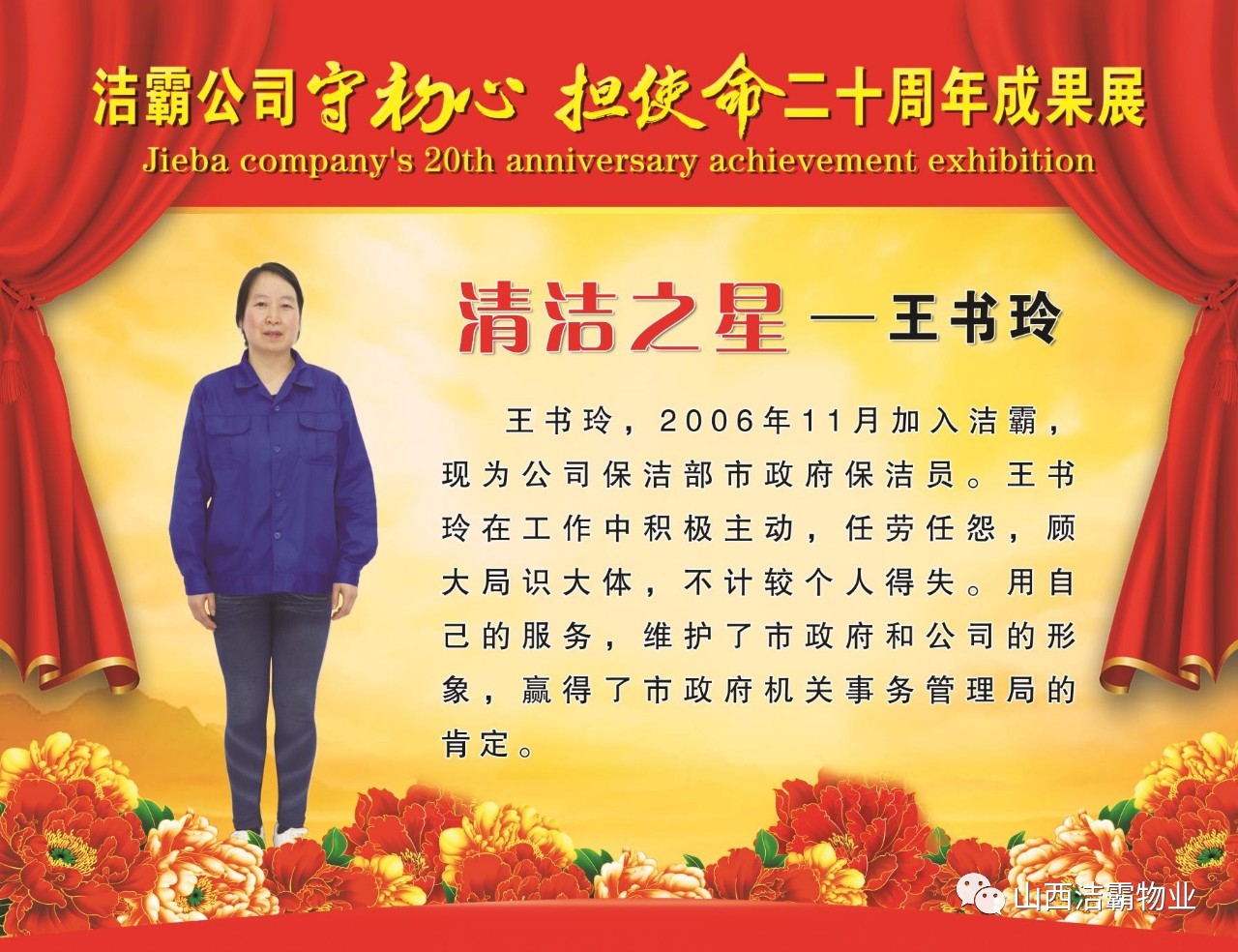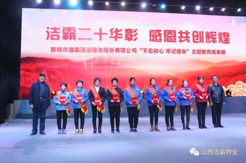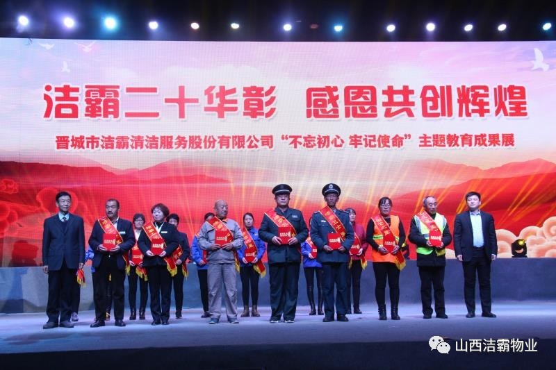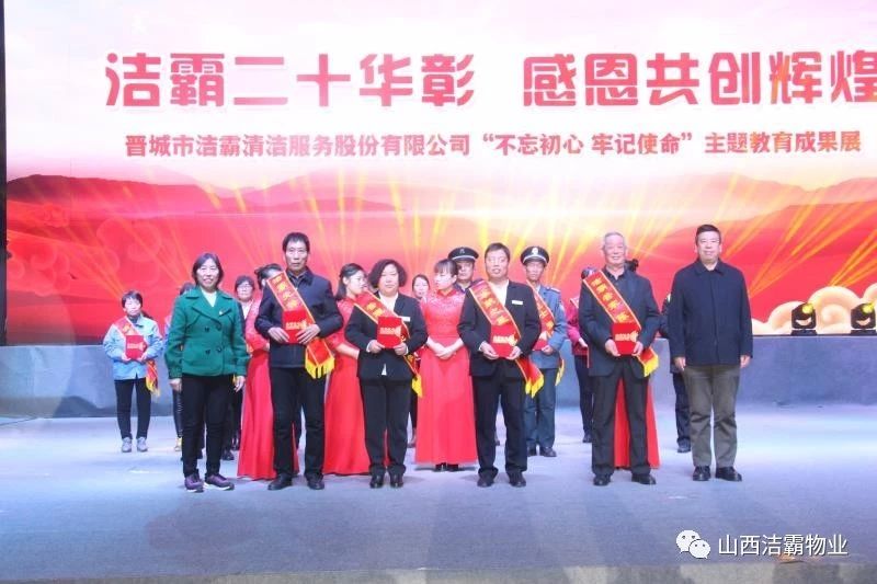 本次晚會以“潔霸二十華彰,感恩共創(chuàng)輝煌”為主題,此次慶典的核心思想是“感恩”,主要角色是潔霸的創(chuàng)業(yè)者。為此,公司對入職潔霸的創(chuàng)業(yè)功勛和一線員工進行了表彰獎勵。本次晚會共設8個獎項,包括“潔霸先鋒”“奉獻之星”“管理之星”“潔霸管家”“潔霸工匠”“清潔之星”“潔霸衛(wèi)士”“園藝之星”等。他們是:李山虎、張永智、史志霞、陳福林、王紅軍、余艷青、劉二丑、成艷粉、楊改梅、王書玲、張國榮、耿竹青、張粉霞、宋秋苗、陳先梅、張晉平、張偉山、趙瑞軍、王廣平、郭志云。晉城市原副市長成育廷、晉城市商務局原局長王新善、晉城市非公和社會組織工委書記郎軍芳、晉城市婦聯三級調研員李蓮菊、晉城市總工會商貿輕紡煙草服務業(yè)工會主席張玉濤、晉城市城區(qū)財政局局長翟明太等領導為他們頒獎。
