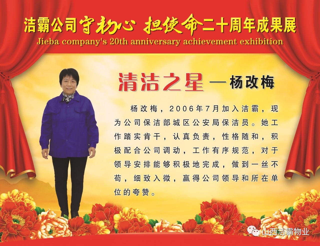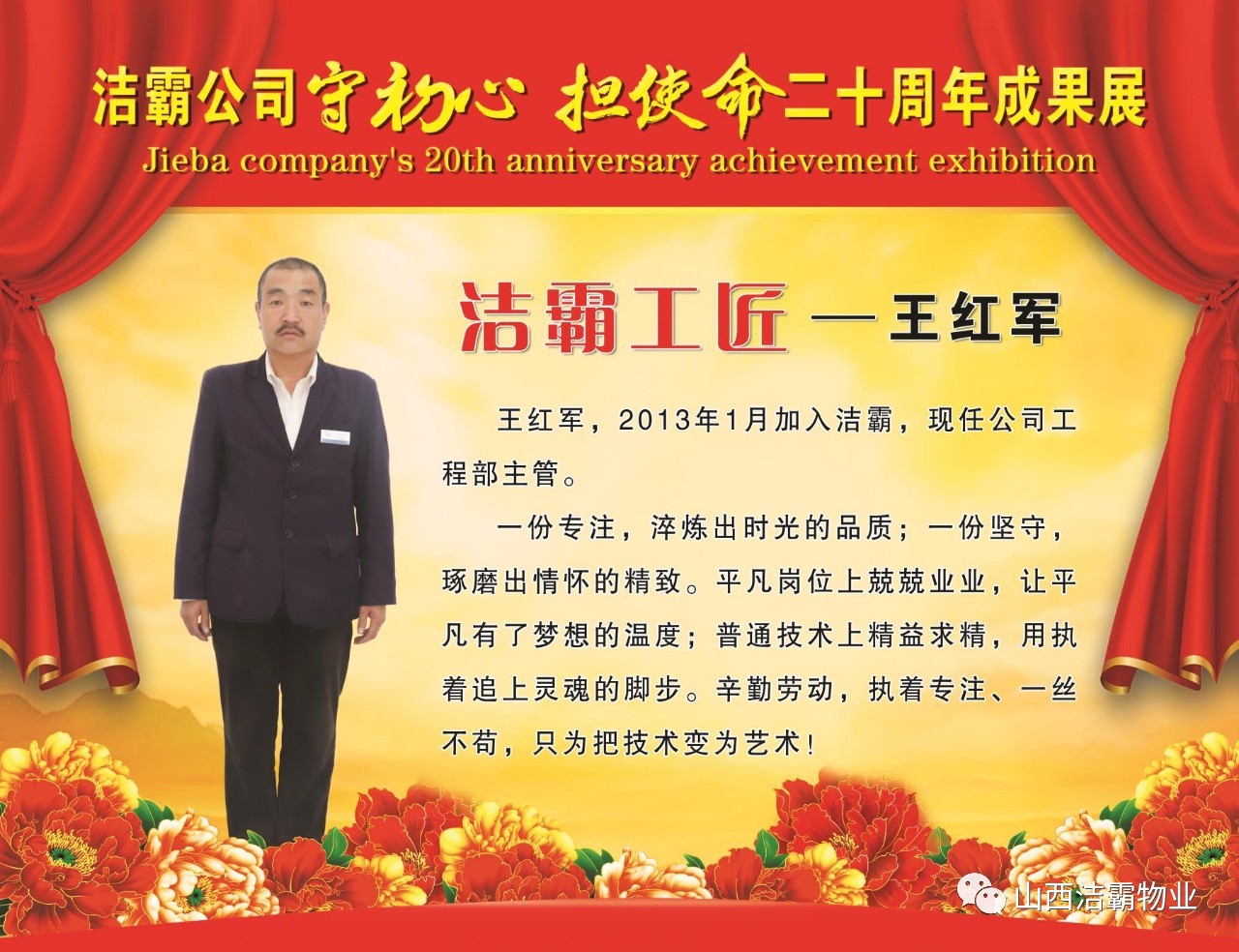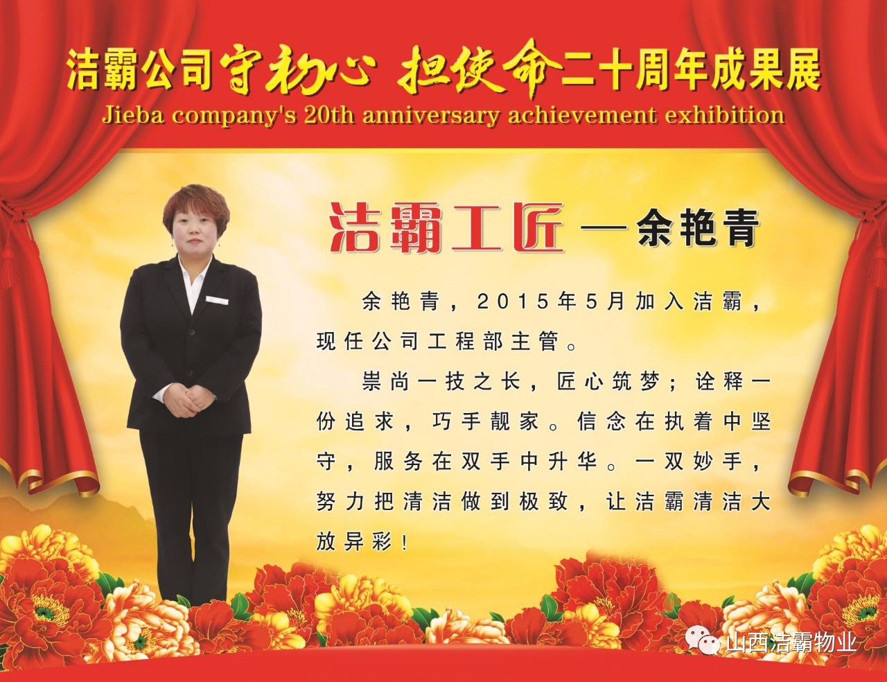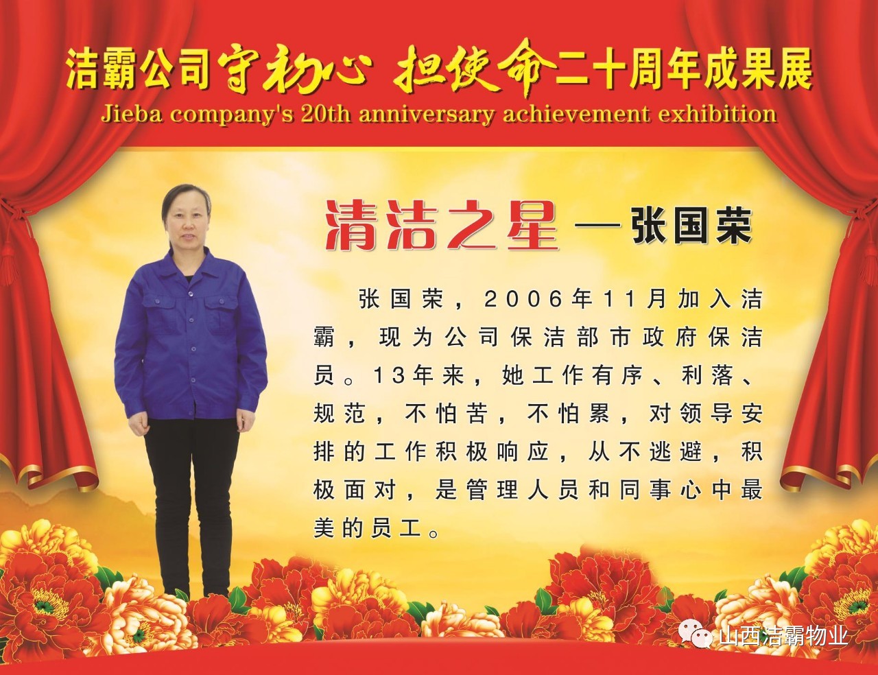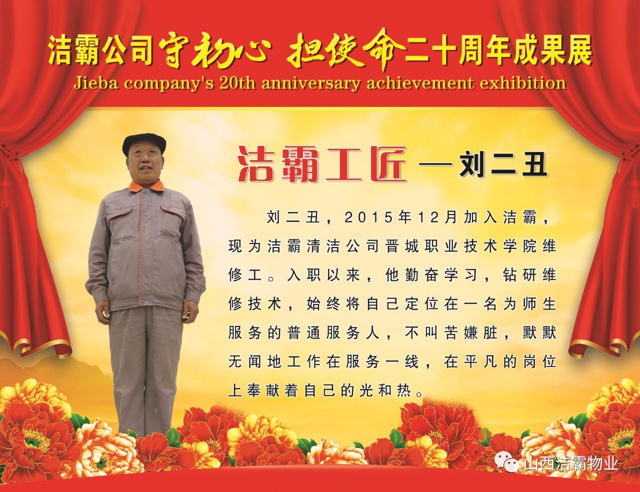 本次晚會以“潔霸二十華彰,感恩共創(chuàng)輝煌”為主題,此次慶典的核心思想是“感恩”,主要角色是潔霸的創(chuàng)業(yè)者。為此,公司對入職潔霸的創(chuàng)業(yè)功勛和一線員工進行了表彰獎勵。本次晚會共設8個獎項,包括“潔霸先鋒”“奉獻之星”“管理之星”“潔霸管家”“潔霸工匠”“清潔之星”“潔霸衛(wèi)士”“園藝之星”等。他們是:李山虎、張永智、史志霞、陳福林、王紅軍、余艷青、劉二丑、成艷粉、楊改梅、王書玲、張國榮、耿竹青、張粉霞、宋秋苗、陳先梅、張晉平、張偉山、趙瑞軍、王廣平、郭志云。晉城市原副市長成育廷、晉城市商務局原局長王新善、晉城市非公和社會組織工委書記郎軍芳、晉城市婦聯三級調研員李蓮菊、晉城市總工會商貿輕紡煙草服務業(yè)工會主席張玉濤、晉城市城區(qū)財政局局長翟明太等領導為他們頒獎。