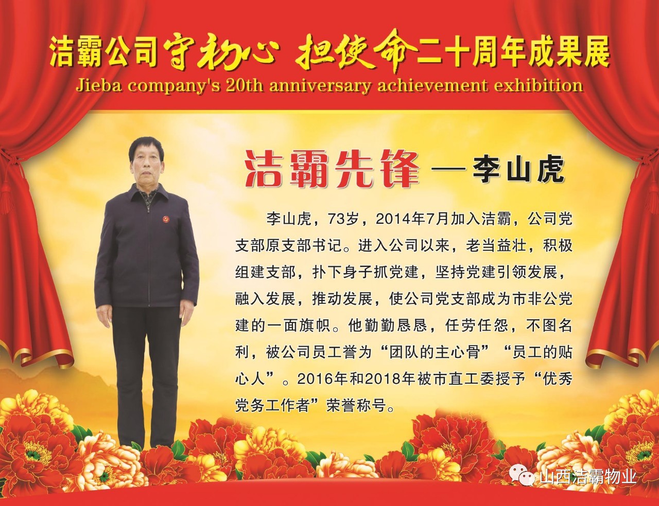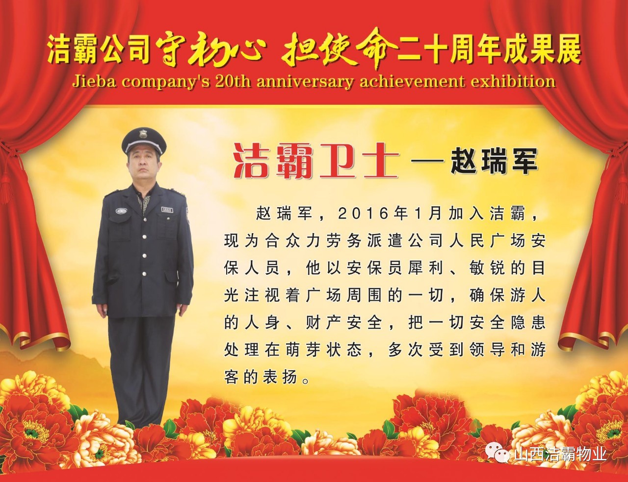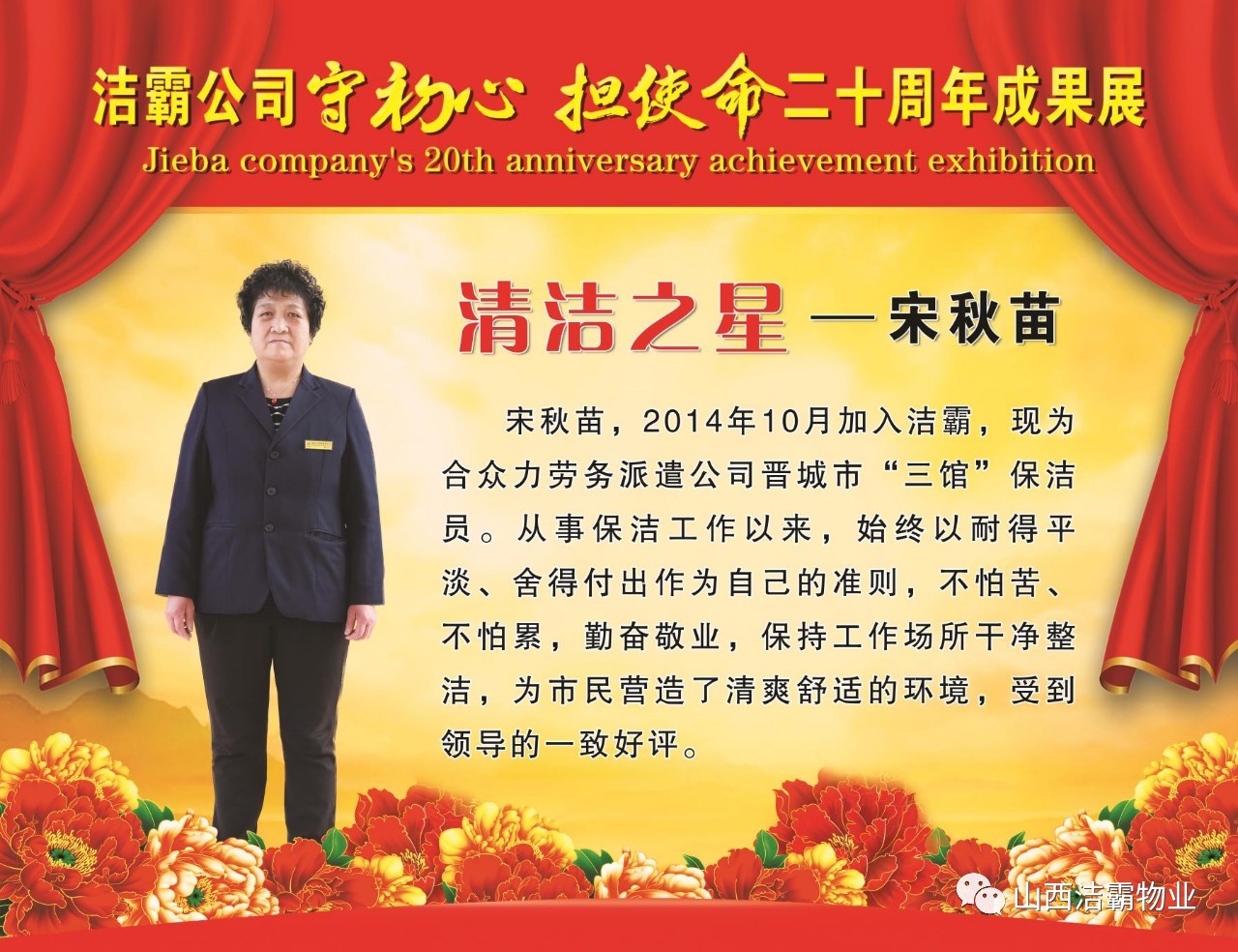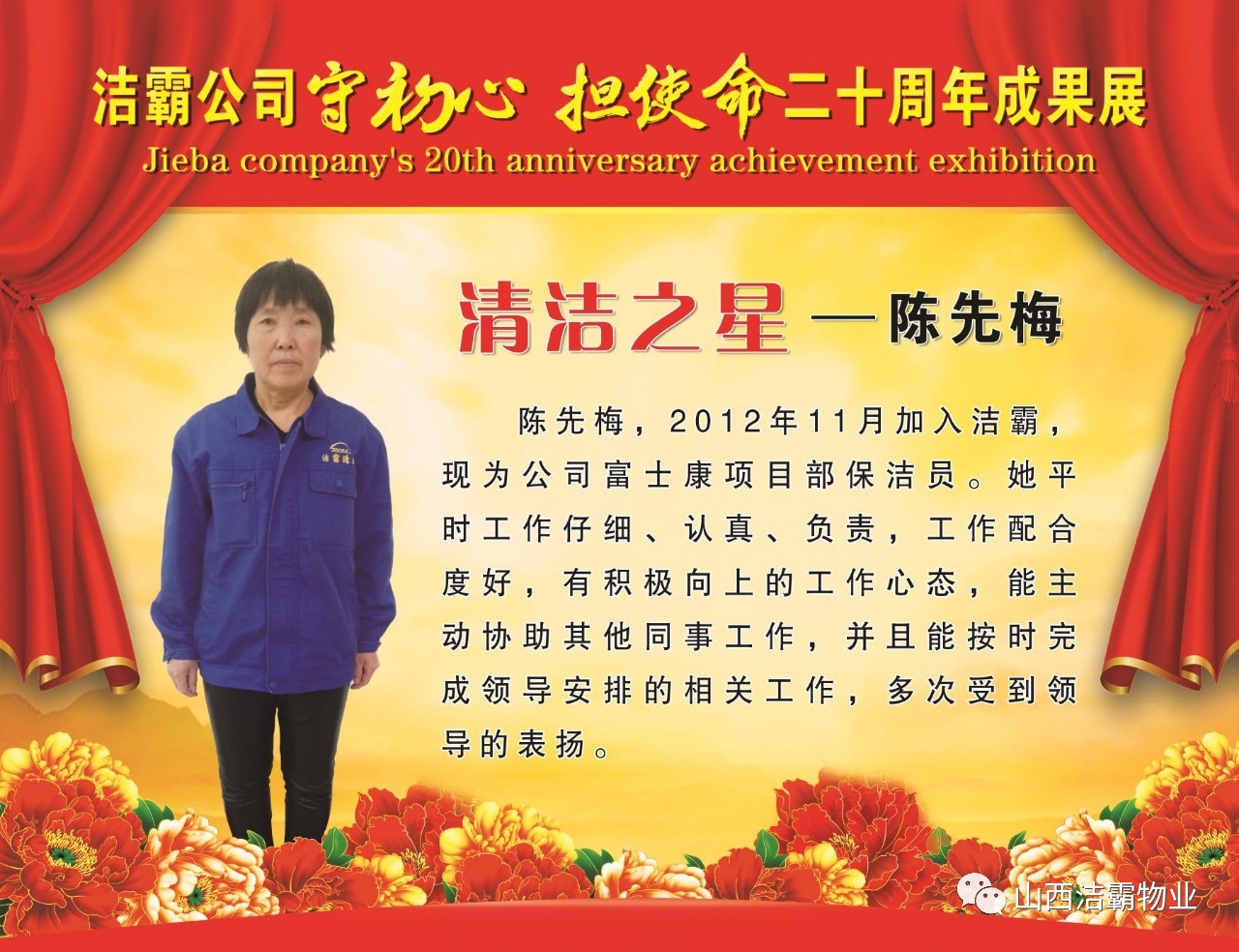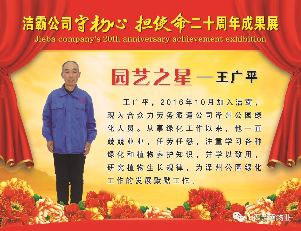 本次晚會以“潔霸二十華彰,感恩共創(chuàng)輝煌”為主題,此次慶典的核心思想是“感恩”,主要角色是潔霸的創(chuàng)業(yè)者。為此,公司對入職潔霸的創(chuàng)業(yè)功勛和一線員工進行了表彰獎勵。本次晚會共設8個獎項,包括“潔霸先鋒”“奉獻之星”“管理之星”“潔霸管家”“潔霸工匠”“清潔之星”“潔霸衛(wèi)士”“園藝之星”等。他們是:李山虎、張永智、史志霞、陳福林、王紅軍、余艷青、劉二丑、成艷粉、楊改梅、王書玲、張國榮、耿竹青、張粉霞、宋秋苗、陳先梅、張晉平、張偉山、趙瑞軍、王廣平、郭志云。晉城市原副市長成育廷、晉城市商務局原局長王新善、晉城市非公和社會組織工委書記郎軍芳、晉城市婦聯三級調研員李蓮菊、晉城市總工會商貿輕紡煙草服務業(yè)工會主席張玉濤、晉城市城區(qū)財政局局長翟明太等領導為他們頒獎。