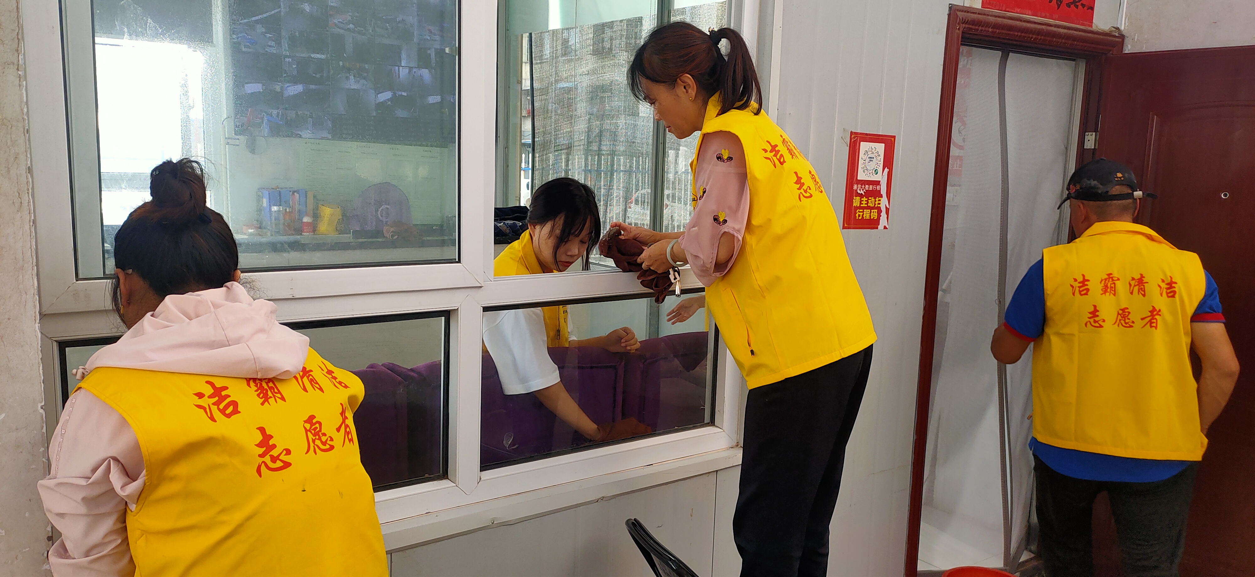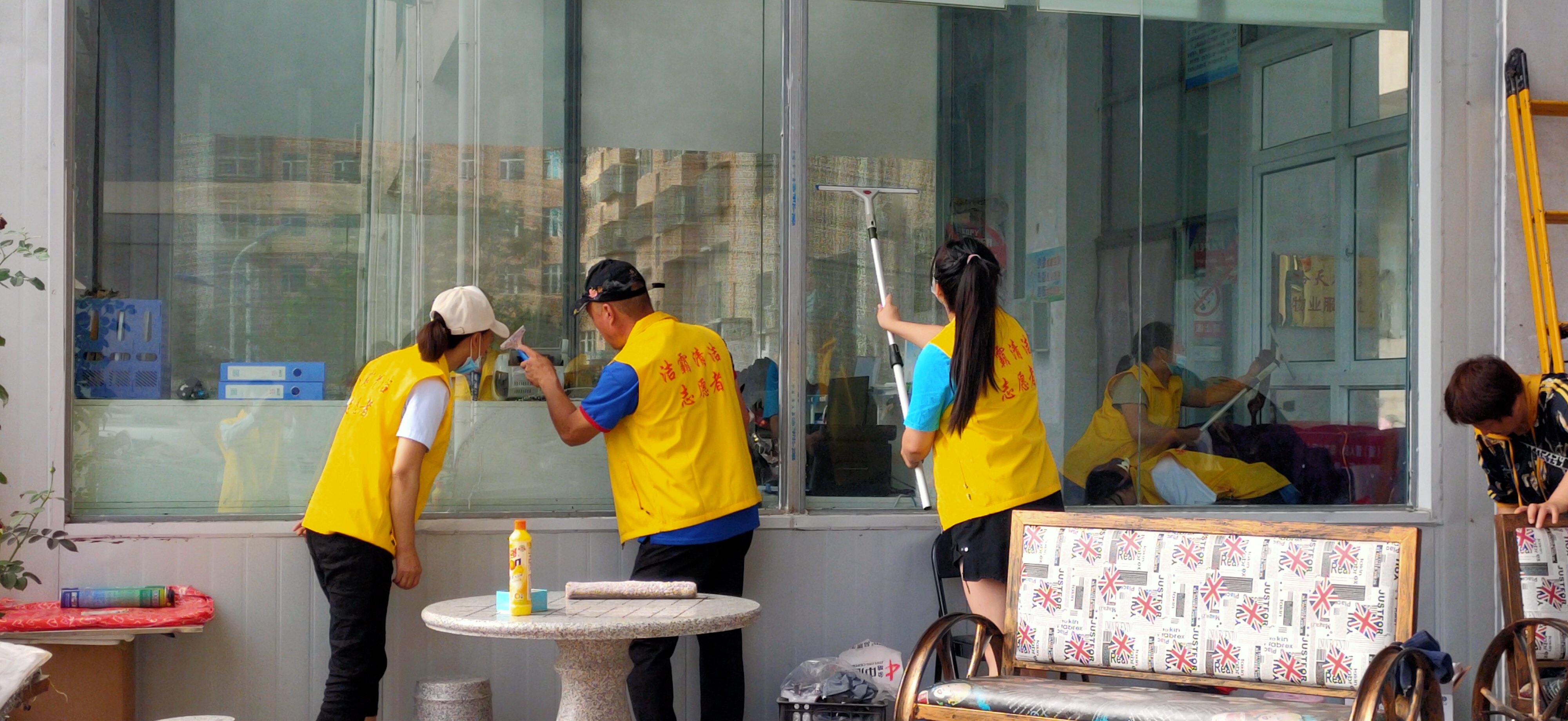 活動現(xiàn)場,志愿者身穿黃色馬甲,自帶玻璃擦、毛巾、笤帚、簸箕等清潔工具,對小區(qū)物業(yè)服務(wù)處及小區(qū)環(huán)境進行清潔打掃。他們有的清掃小區(qū)天臺上的垃圾;有的清理樓道門及公共設(shè)施上的牛皮癬;有的擦拭門衛(wèi)的玻璃;有的清洗紗窗;有的清洗物業(yè)服務(wù)處的玻璃幕墻……志愿者個個干勁十足,不怕臟、不怕累,經(jīng)過一個多小時的團結(jié)協(xié)作,小區(qū)環(huán)境煥然一新。