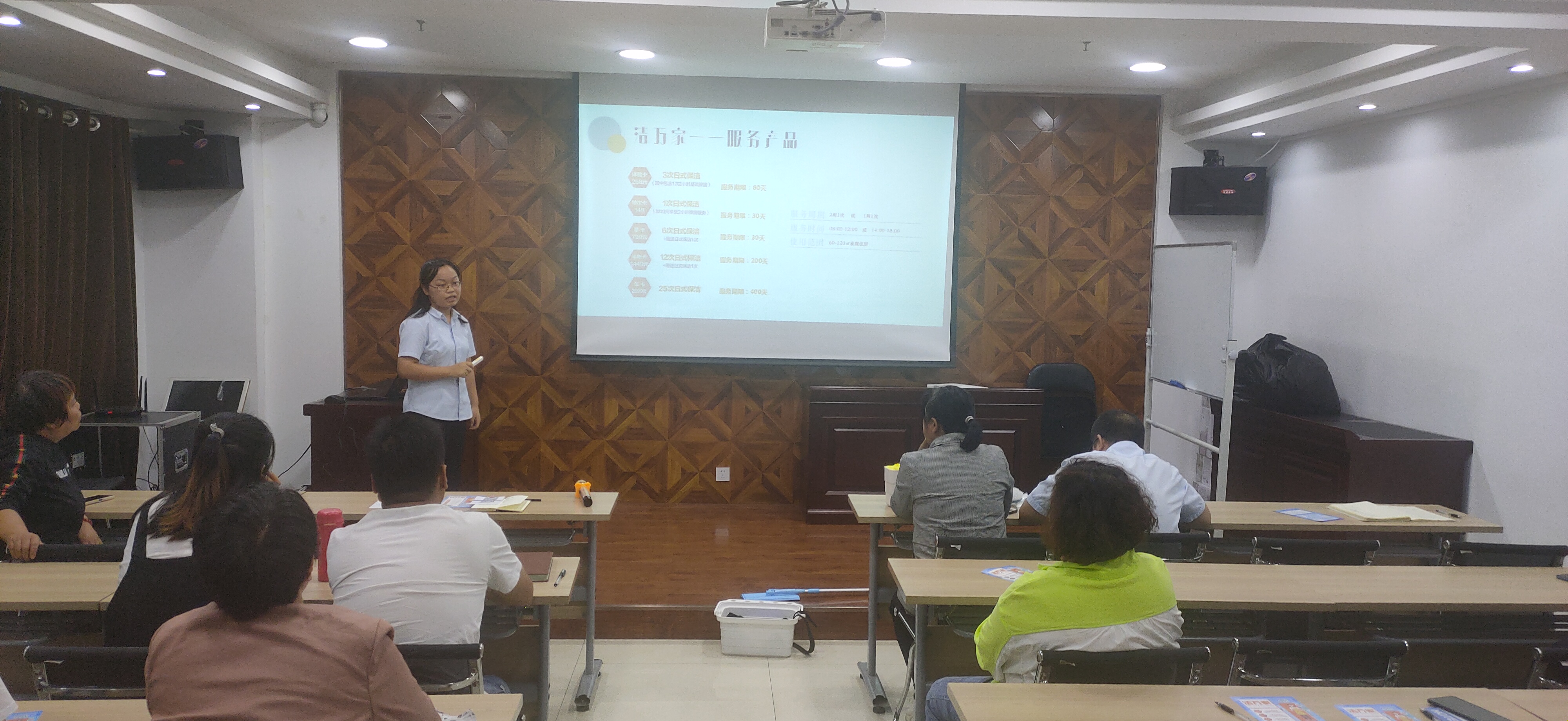 隨后由公司人力資源部負責人司夢琴對“潔萬家”日常保潔產(chǎn)品進行了分類介紹,此外還介紹了產(chǎn)品推廣獎勵方案和推廣話術,對大家日后推廣過程中會遇到的客戶提出的各種問題進行了預設并一一詳細作答。