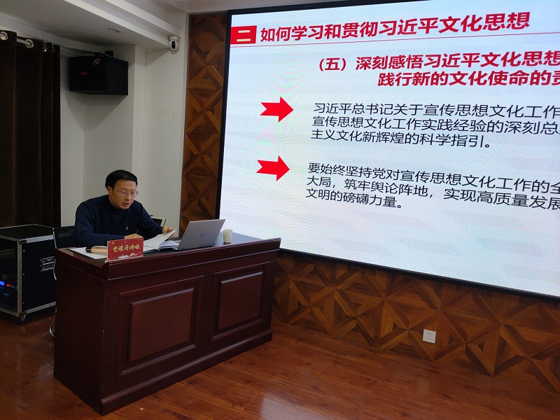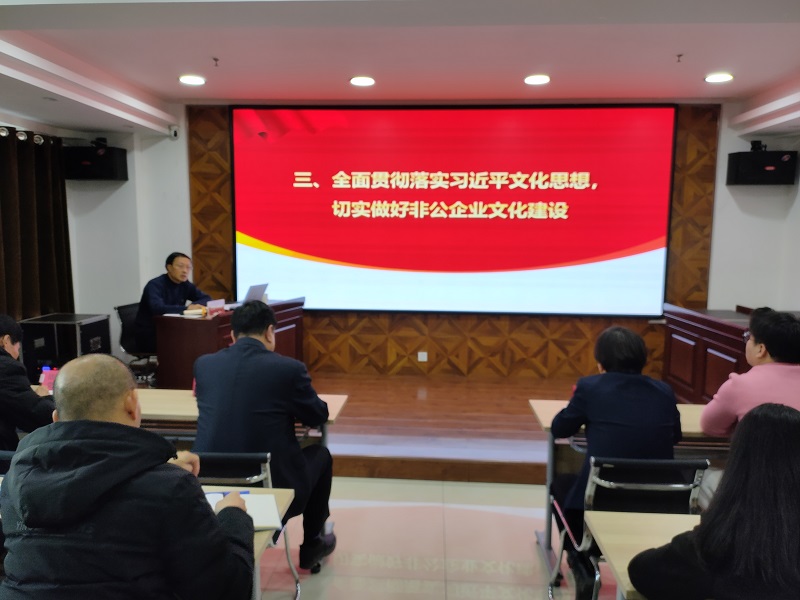 郝天順從習(xí)近平總書(shū)記對(duì)宣傳思想文化工作作出的重要指示談起,從“如何認(rèn)識(shí)和理解習(xí)近平文化思想 ”“如何學(xué)習(xí)和貫徹習(xí)近平文化思想”“全面貫徹落實(shí)習(xí)近平文化思想,切實(shí)做好非公企業(yè)文化建設(shè)”三個(gè)方面進(jìn)行了深刻闡述,指出習(xí)近平文化思想既有文化理論觀(guān)點(diǎn)上的創(chuàng)新和突破,又有文化工作布局上的部署要求,明體達(dá)用、體用貫通,明確了新時(shí)代文化建設(shè)的路線(xiàn)圖和任務(wù)書(shū),在我國(guó)社會(huì)主義文化建設(shè)中展現(xiàn)出了強(qiáng)大偉力,為做好新時(shí)代新征程宣傳思想文化工作、擔(dān)負(fù)起新的文化使命提供了強(qiáng)大思想武器和科學(xué)行動(dòng)指南,并結(jié)合非公企業(yè)實(shí)際,要求要緊緊圍繞學(xué)習(xí)貫徹習(xí)近平文化思想,圍繞貫徹黨的二十大關(guān)于文化建設(shè)的戰(zhàn)略部署,強(qiáng)化黨建引領(lǐng)作用,帶動(dòng)企業(yè)文化發(fā)展,將文化建設(shè)作為企業(yè)戰(zhàn)略,不斷創(chuàng)新文化理念,將企業(yè)文化實(shí)體化、制度化,促進(jìn)企業(yè)文化升華,推動(dòng)各項(xiàng)工作落地見(jiàn)效。