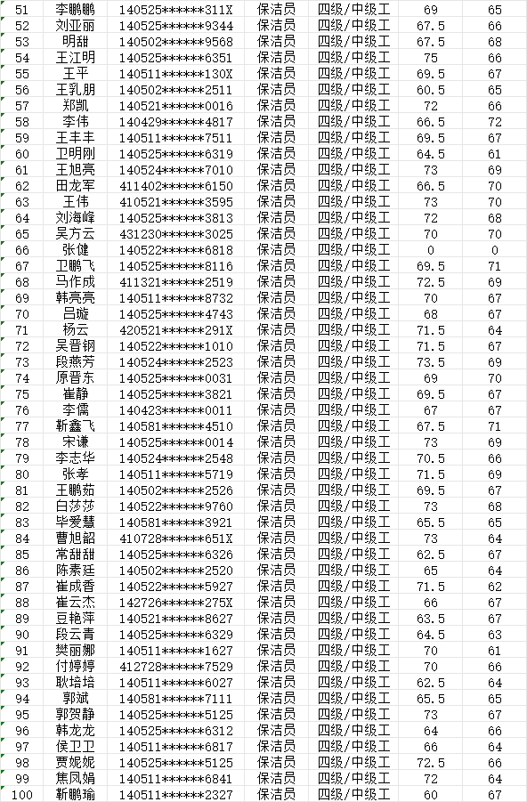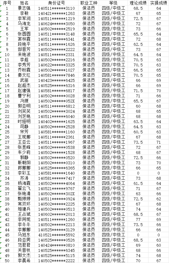 晉城市潔霸清潔服務(wù)股份有限公司職業(yè)技能等級(jí)認(rèn)定中心現(xiàn)將2024年1月28日認(rèn)定人員成績公示如下: