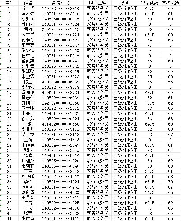 晉城市潔霸清潔服務(wù)股份有限公司職業(yè)技能等級認(rèn)定中心 2024年5月26日第17批家政服務(wù)員初級認(rèn)定人員成績公示