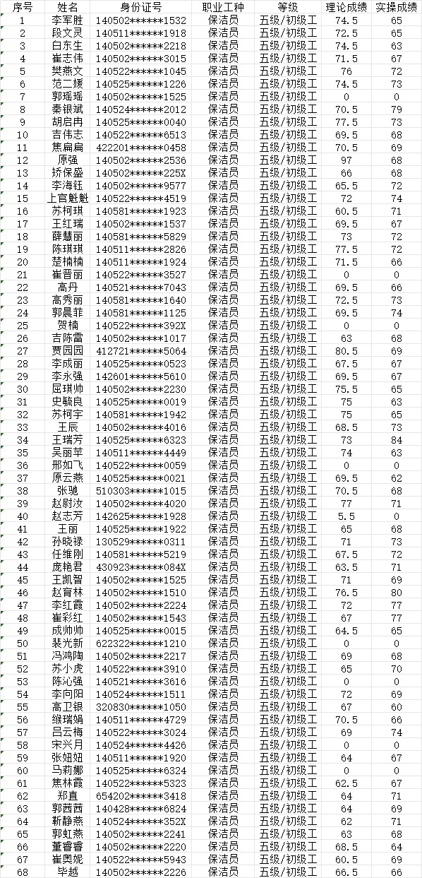 晉城市潔霸清潔服務股份有限公司職業(yè)技能等級認定中心現(xiàn)將2024年7月7日認定人員成績公示如下: