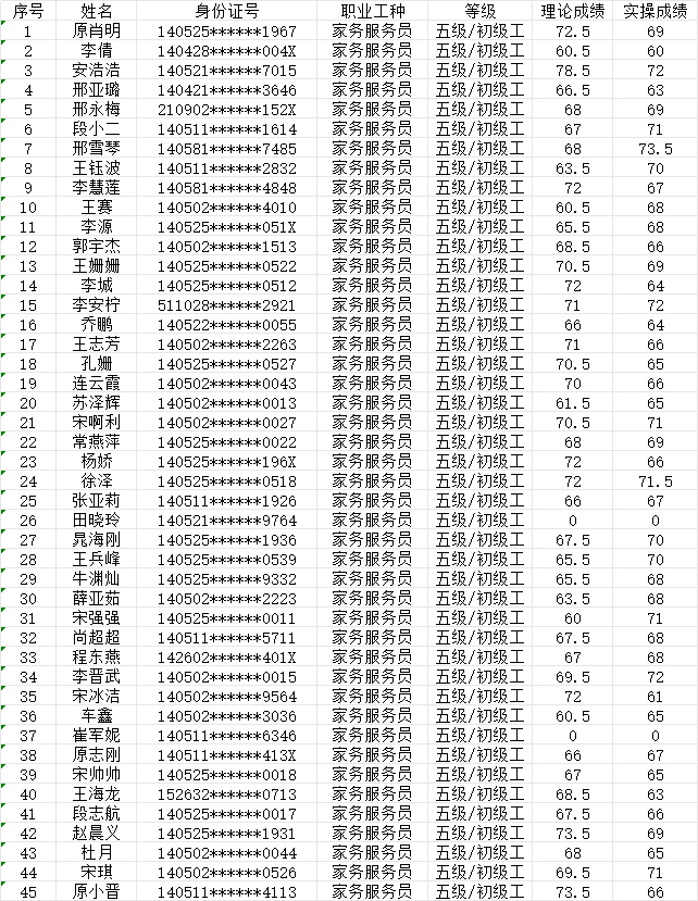 晉城市潔霸清潔服務(wù)股份有限公司職業(yè)技能等級(jí)認(rèn)定中心現(xiàn)將2024年9月28日認(rèn)定人員成績公示如下: