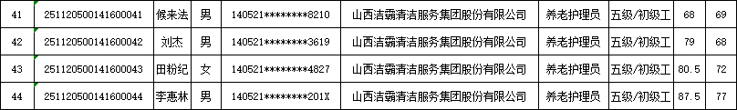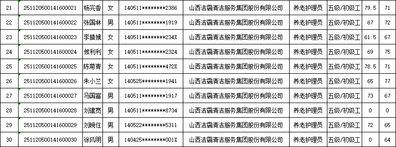 山西潔霸清潔服務(wù)集團(tuán)股份有限公司職業(yè)技能等級認(rèn)定中心現(xiàn)將2025年11月22日認(rèn)定人員成績公示如下: